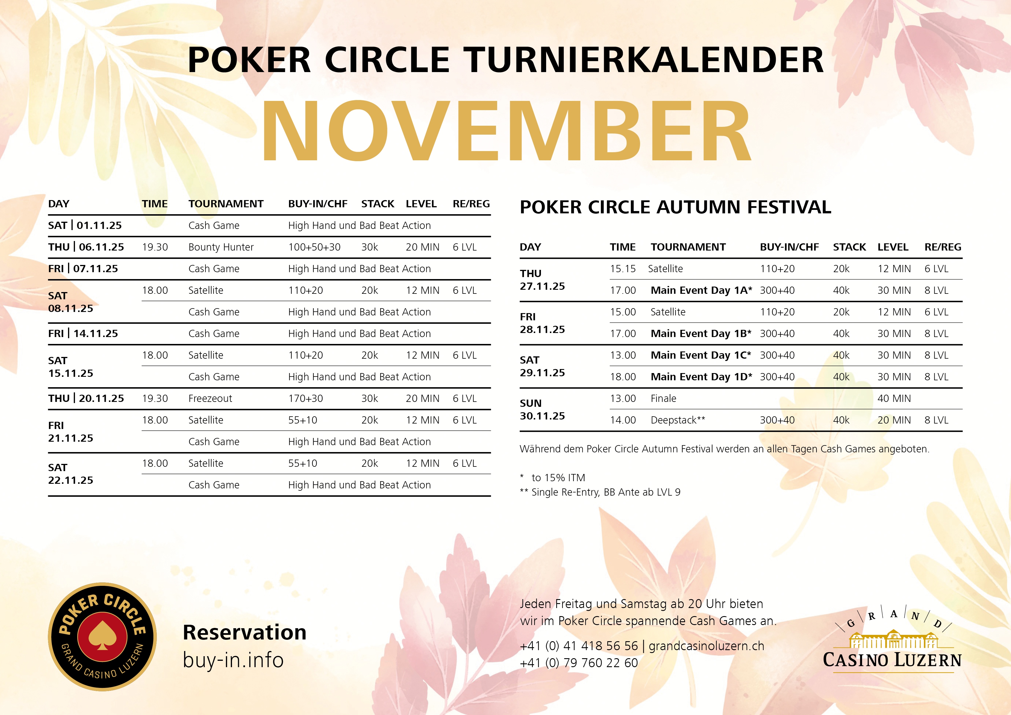 Im Poker Circle erwarten Sie regelmässig spannende Turniere sowie jeden Freitag & Samstag ab 20 Uhr aufregende Cash Games.